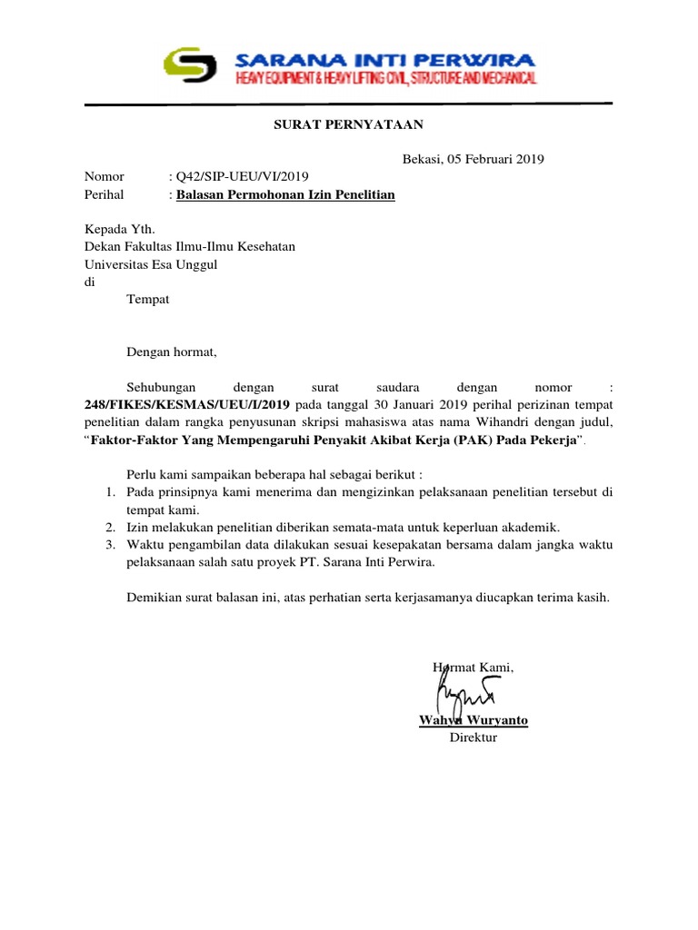 Contoh Surat Balasan Instansi Perusahaan Untuk Skripsi Dan Tugas Akhir from herugan.com Surat balasan izin penelitian fe novita juni 201666666.docx. Feb 09, 2021 · contoh surat balasan penelitian contoh surat balasan penelitian skripsi dari perusahaan contoh surat balasan izin penelitian skripsi dari perusahaan kumpulan Telepon (0352) 123456 fax (0352) 123123. Langsung saja berikut formatnya bila membantu, jangan lupa like & sharenya ya ^_^ : Contoh surat balasan instansi perusahaan untuk skripsi dan. Surat permohonan ini dibuat oleh pihak universitas kampus jika lingkup kampus yang luas surat ini akan dikeluarkan oleh bagian jurusan program studi namun pada kasus. 63 lampiran 1 surat izin penelitian. Contoh surat balasan izin penelitian skripsi dari perusahaan contoh surat keterangan ahli waris sahabat contoh kali ini admin akan sedikit berbagi contoh mengenai contoh surat pernyataan ahli waris tentu ini surat yang dibilang sangat penting ketika terjadi.